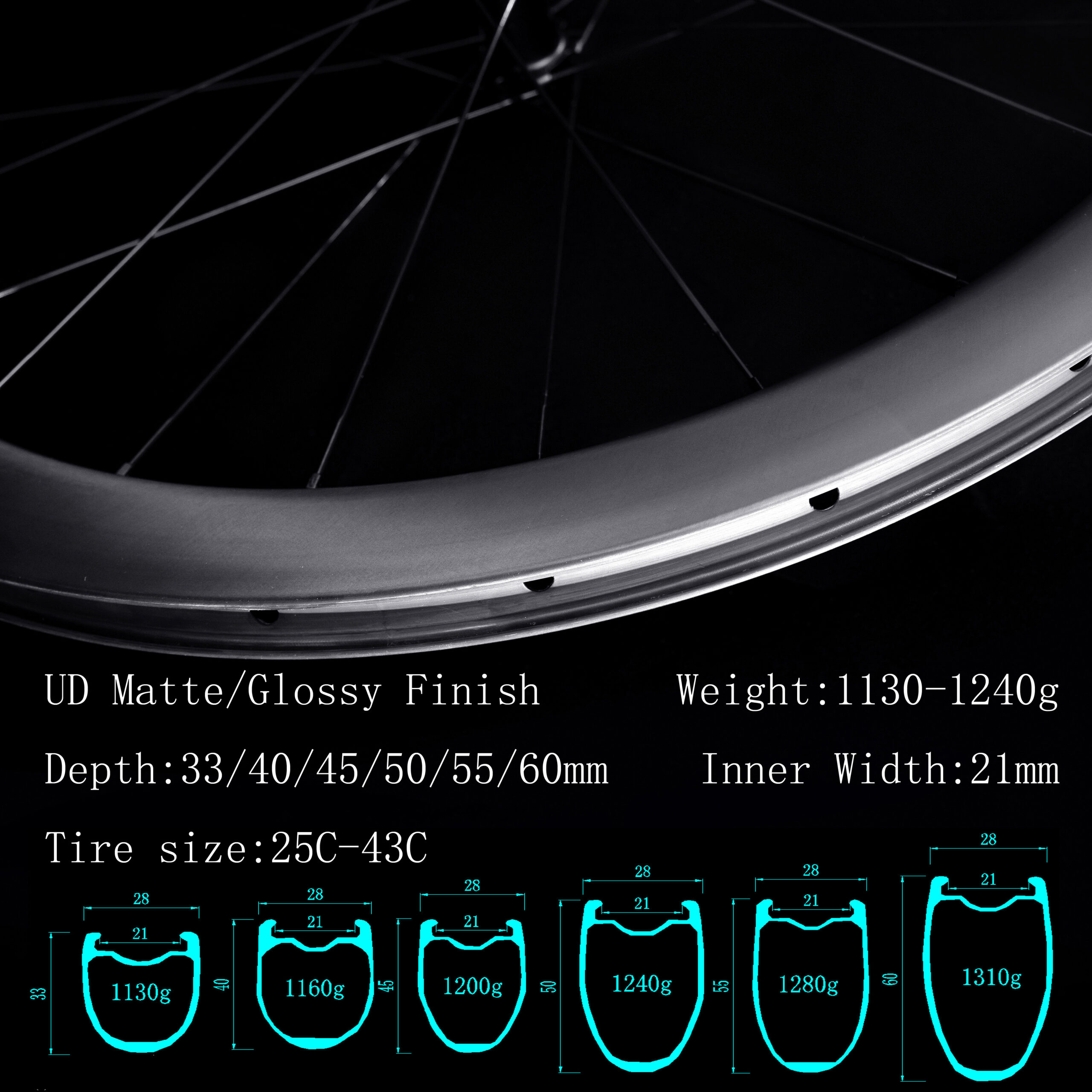 Inner width 21mm,1160g,perfect design.After extensive testing, these wheels deliver an outstanding balance of light weight, rigidity, and durability. The lightweight carbon design improves overall efficiency, while the strong structure ensures stable handling in various conditions. I’ve recorded a noticeable increase in average speed with less effort. After hundreds of kilometers, the wheels show no signs of wear or deformation. Highly recommended for riders who value quality and long-term reliability.